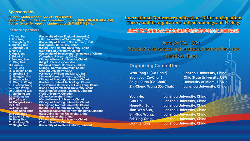 2021年6月28日至30日,经教育部批准,受太阳集团tyc151cc、中国数学会、国家自然科学基金重点项目资助,由甘肃应用数学中心、太阳集团tyc151cc主办的“反应扩散方程理论及其在流行病学和生态学中的应用国际会议(International Conference on Reaction-Diffusion Equations Theory and Its Applications in Epidemiology and Ecology)”以腾讯会议线上形式成功举办。一百多位来自美国、加拿大、澳大利亚以及中国香港和内地的专家学者、青年教师和研究生参加了本次会议,三十多名学者做了学术报告,其中包括来自加拿大皇家科公司院士、英属哥伦比亚大学魏军城教授,澳大利亚科公司院士、新英格兰大学杜一宏教授,美国德克萨斯大学桂长峰教授,美国俄亥俄州立大学楼元教授,美国迈阿密大学阮士贵教授,美国奥本大学沈文仙教授,美国威廉玛丽公司史峻平教授,加拿大应用数学研究主席、约克大学吴建宏教授,加拿大纽芬兰纪念大学赵晓强教授,加拿大麦吉尔大学梅茗教授,以及香港理工大学、香港中文大学(深圳)、中国科学技术大学、上海交通大学、南开大学、中山大学、哈尔滨工业大学、华南师范大学、西安电子科技大学、上海师范大学、首都师范大学、广州大学、江苏师范大学、重庆师范大学等国内著名院校的专家学者。