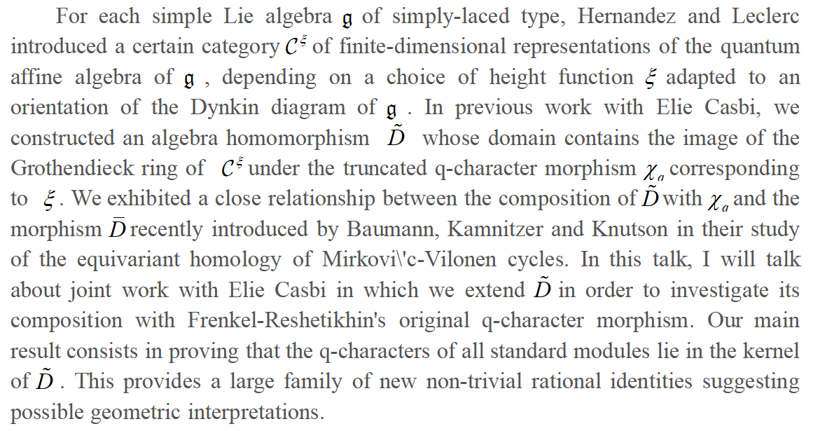 报告题目二: Auslander-Reiten combinatorics and q-characters of representations of quantum affine algebras