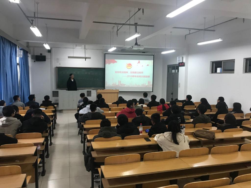 每年的12月4日是国家宪法日,为了增强广大团员的宪法意识,弘扬宪法精神,加强宪法实施,2018级两班团支部分别召开了以“宣传宪法精神,构建和谐校园”为主题的团课。