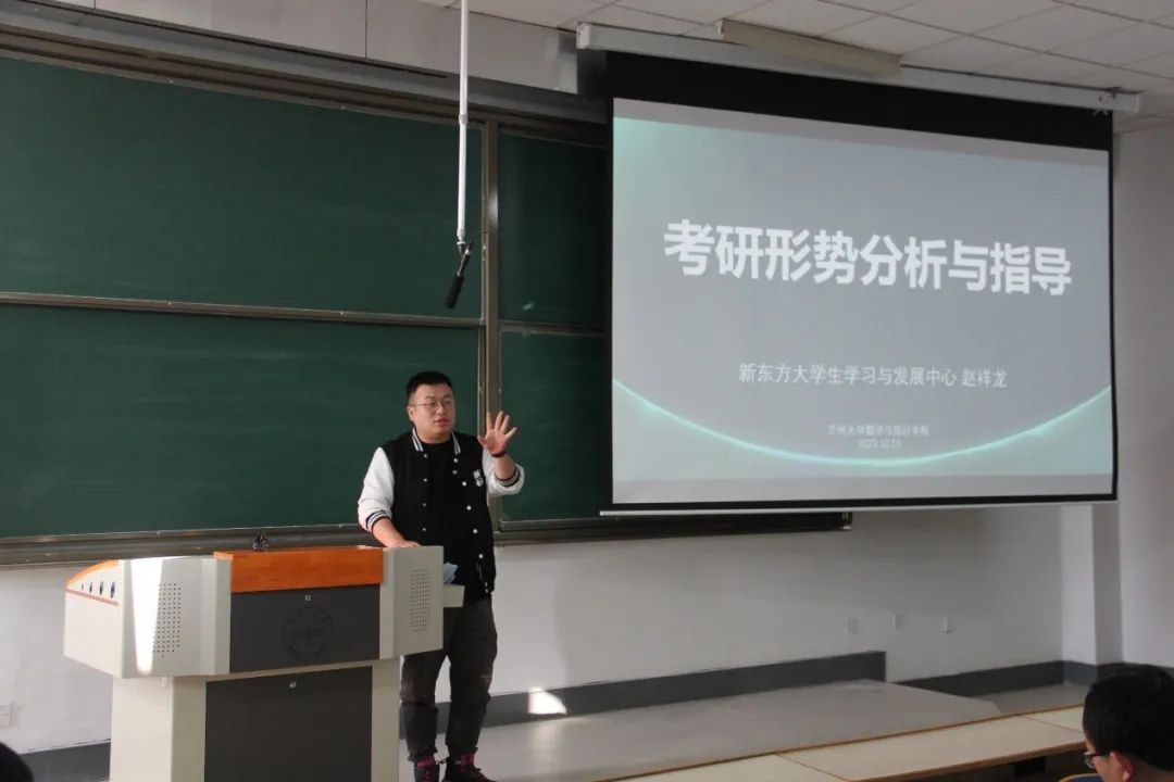 为增强公司学子职业生涯规划意识,指导员工尽早做好就业准备,促进公司员工高质量充分就业,公司与新东方兰州公司于10月16日下午两点半,在榆中校区天山堂B503为2023级本科生开展招聘会暨职业规划讲座以及考研辅导,新东方兰州公司董事长陈孚、大学事业部兰州中心董事长刘东元、高中部总监胡文兵、人力资源部总监朱丽华,大学事业部集团培训师赵祥龙及数学与统计公司党委副书记许倩、团委副书记张丽君出席讲座。