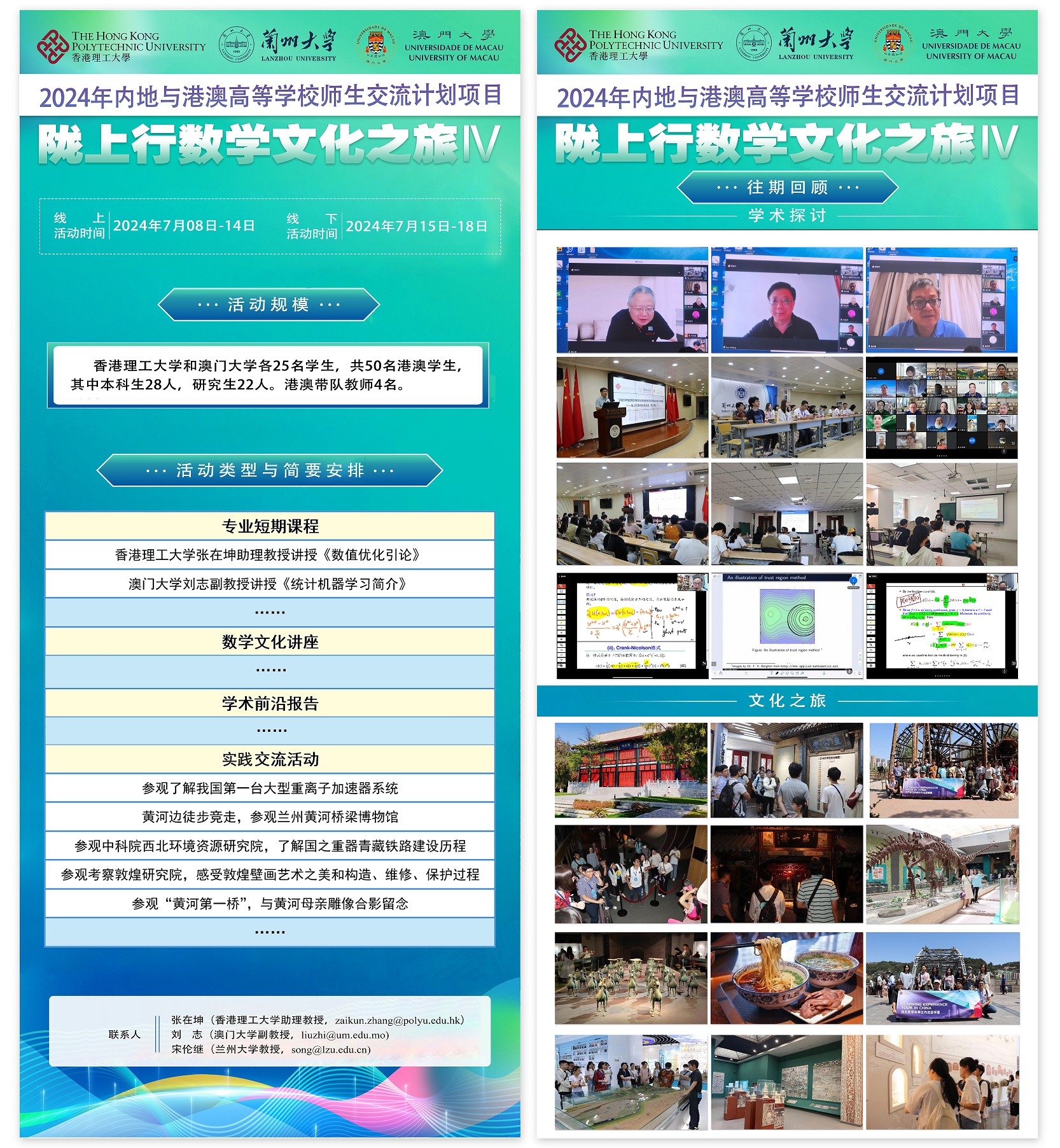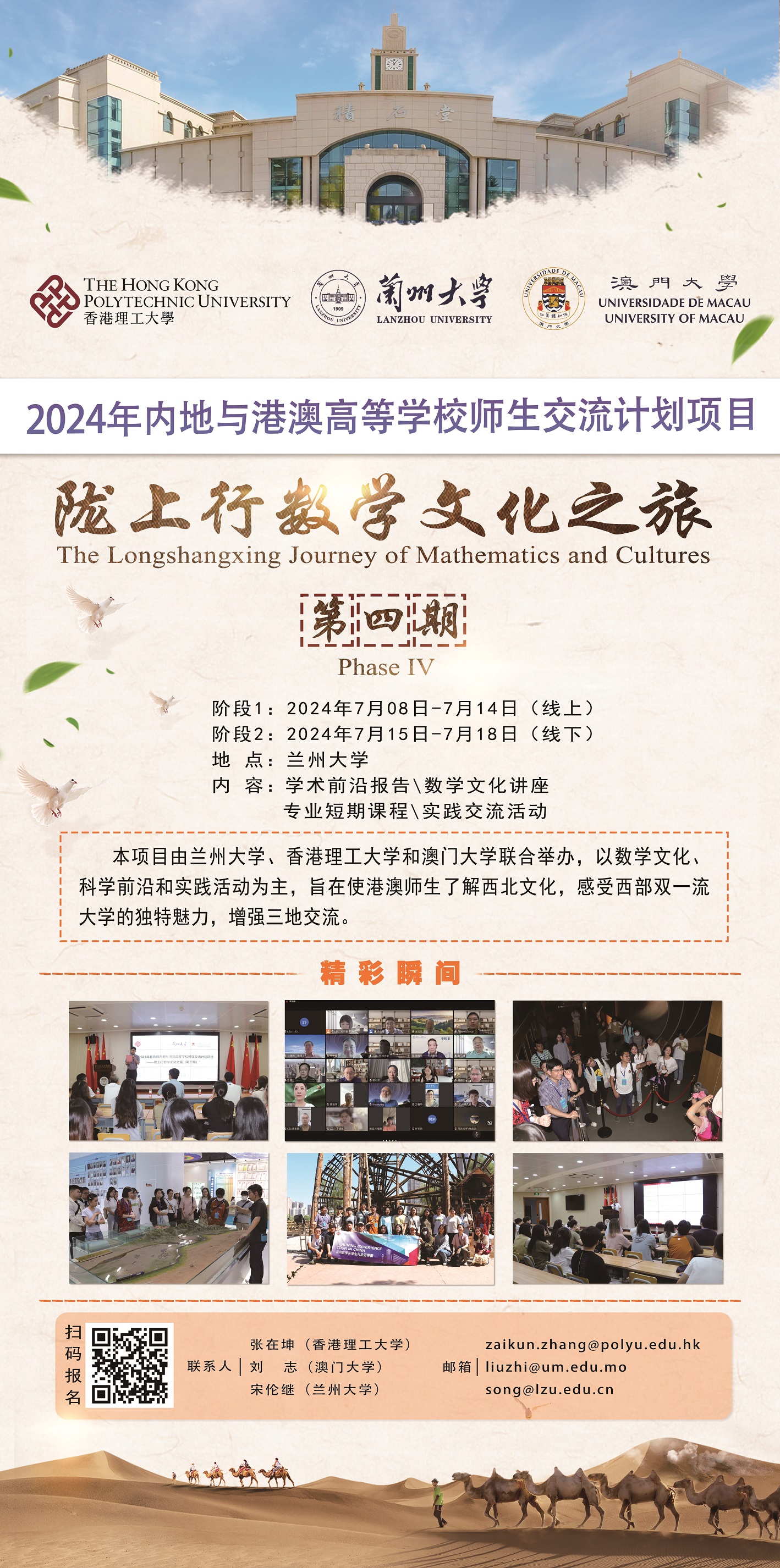 (3)教育部港澳与内地高校交流项目:“2024年内地与港澳高等公司师生交流计划项目——陇上行数学文化之旅(第四期)”于7月8日至18日在太阳集团tyc151cc举行。本项活动受教育部近年连续资助,由太阳集团tyc151cc承办,联合香港理工大学、澳门大学师生,通过专业短期课程、前沿讲座报告、实践交流活动等形式,交流探讨学科前沿进展与应用,促进两地学子探究学科问题、学习科研方法,产生文化共鸣,增强文化自信,提升自身能力和专业知识。