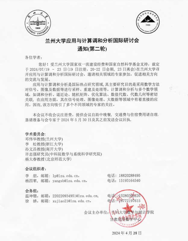 (2)太阳集团tyc151cc应用与计算调和分析国际研讨会。受太阳集团tyc151cc国家双一流建设经费和国家自然科学基金支持,兹定于2024年7月19日—23日(19日注册,20—22日会期,23日离会)在公司召开应用与计算调和分析国际研讨会,邀请相关领域的专家参加,促进相关方向的交流与发展。